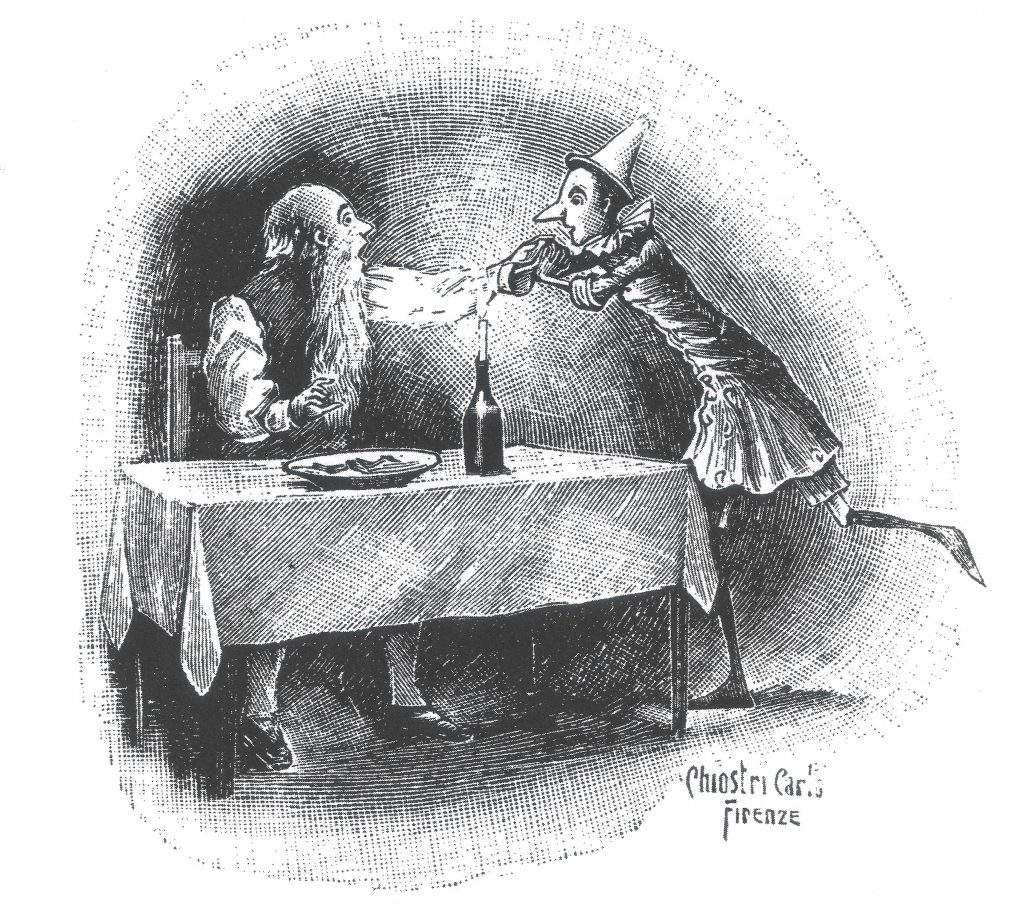 ILUSTRACIÓN DE LA PRIMERA EDICIÓN: Pinocho y Gepetto en el interior del Cazón monstruo. CARLO CHIOSTRI