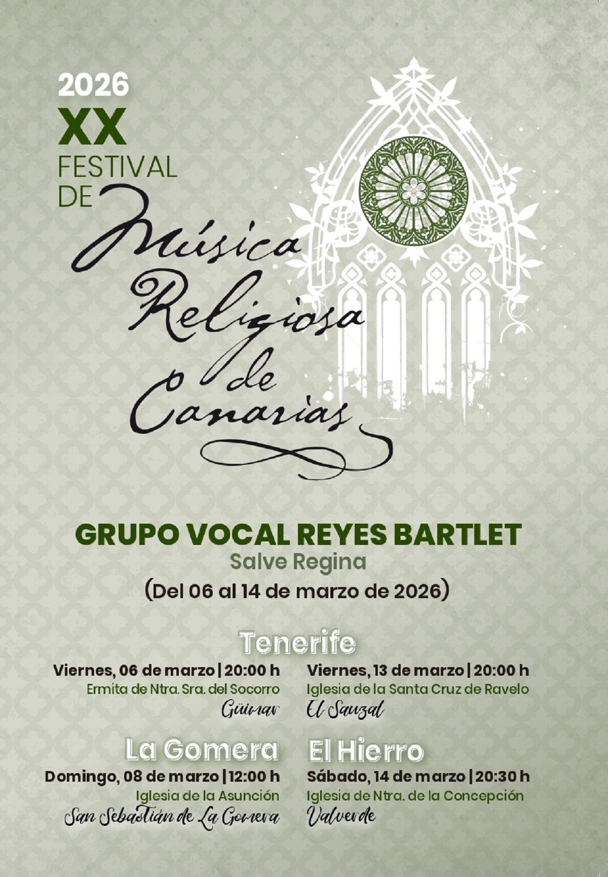 El Festival de Música Religiosa de Canarias introduce la polifonía en su vigésima edición con el Grupo Vocal Reyes Bartlet. La formación coral portuense se hace cargo del tercer programa del festival, con Salve Regina, dedicado a la figura de la Virgen María, con el que recorre distintas iglesias de Tenerife, La Gomera y El Hierro entre el 6 y el 14 de marzo. Salve Regina presenta obras de Francisco Guerrero, Tomás Luis de Victoria, Monteverdi, Josquin Des Prez y otros maestros del Siglo de Oro, bajo la dirección de José Híjar Polo.