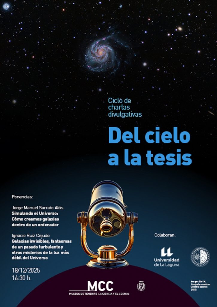 El Museo de la Ciencia y el Cosmos (MCC) del Cabildo de Tenerife acoge este jueves 18 de diciembre, a las 16:30 horas, una nueva cita del ciclo ‘Del cielo a la tesis’, organizado junto al Instituto de Astrofísica de Canarias (IAC). En esta ocasión, las ponencias profundizarán en las simulaciones cosmológicas y la astronomía de bajo brillo superficial, dos herramientas esenciales para comprender la evolución del cosmos y desvelar algunos de sus misterios.