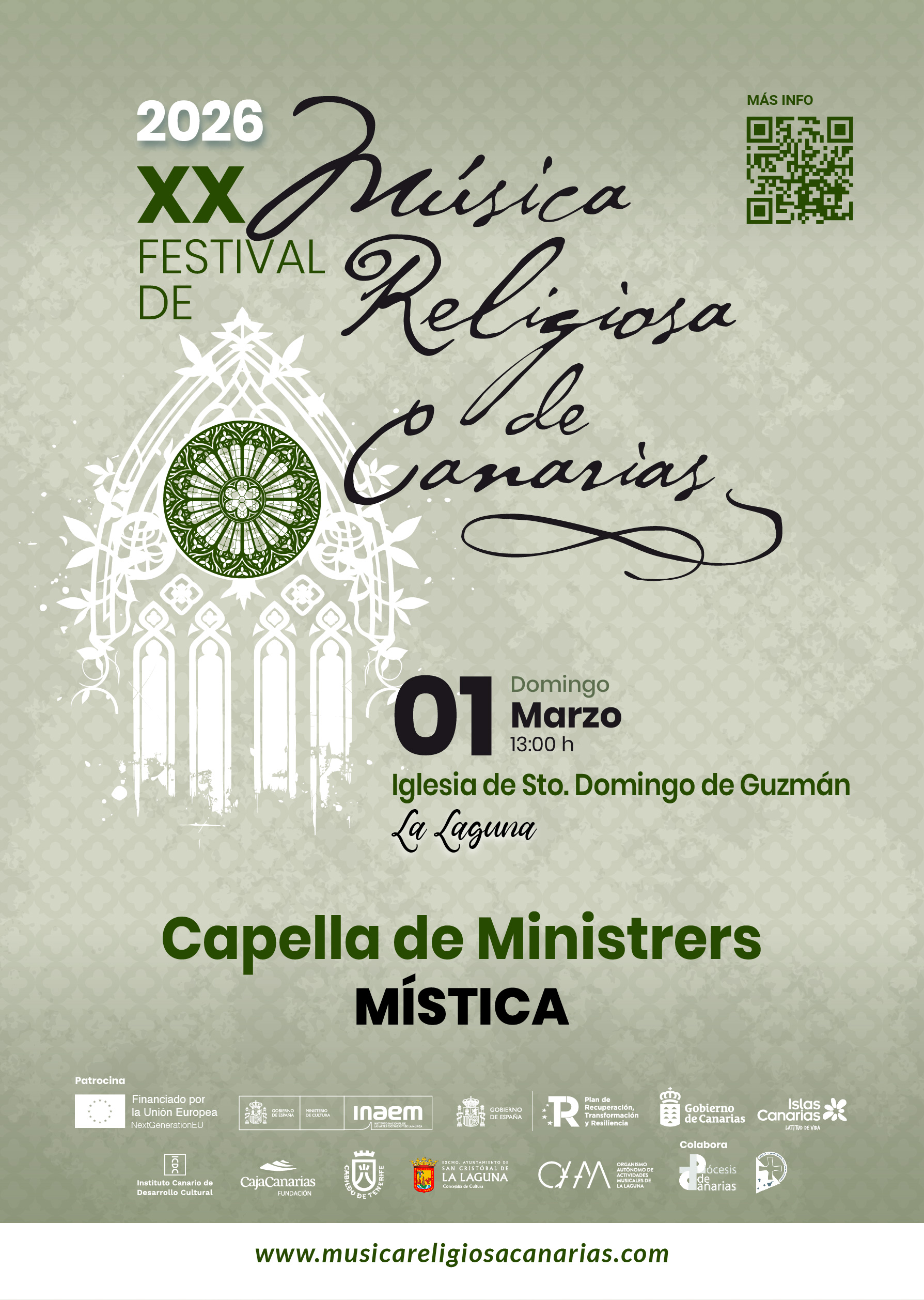 El Festival de Música Religiosa de Canarias cuenta en este 2026 con el patrocinio del Gobierno de Canarias, en su Área de Cultura y la empresa pública de la Consejería de Turismo, Promotur, con fondos de programa de Recuperación, Transformación y Resiliencia, y el Instituto Nacional de las Artes Escénicas y de la Música (INAEM) del Ministerio de Cultura, con Fondos Next Generation de la UE. La presentación de este primer programa en La Laguna cuenta con el apoyo del Cabildo de Tenerife y el Ayuntamiento de La Laguna, además de la colaboración de Diócesis Nivariense y la Fundación CajaCanarias.