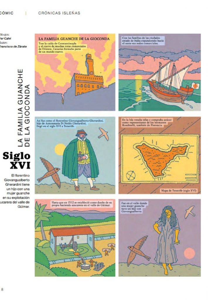 -Junto con mi socio el guionista canario, Francisco de Zárate, venimos trabajando hace ya un tiempo en este proyecto. Primero hicimos una serie sobre la historia de la aviación vinculada a Canarias, y la verdad es que me pareció una idea divertida y muy apropiada para una revista que se lee en aviones. Y ahora en lo que va de año estamos haciendo una serie que se llama Crónicas isleñas, que básicamente consiste en contar distintas historias que van de lo histórico a lo pop y de lo divulgativo a lo legendario.