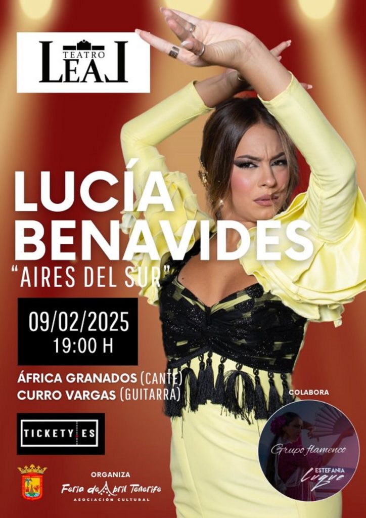 El Teatro Leal de La Laguna acoge este domingo, 9 de febrero, a las 19:00 horas, el nuevo espectáculo de la bailaora Lucía Benavides. La joven artista presentará por primera vez en Canarias Aires del sur, una muestra de flamenco de raíz.