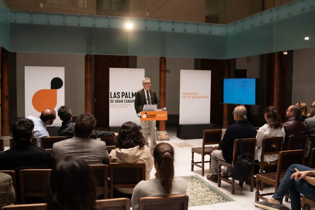 “Cuando construyo la marca para la candidatura de Las Palmas de Gran Canaria, hay elementos muy relacionados con la ciudad, con su lugar dentro del espacio físico entre África, América y Europa, su límite ultraperiférico. Es algo que nos caracteriza. Y cuando conozco con posterioridad el lema elegido, ‘Rebelión de la geografía’, me doy cuenta de que ha habido un encuentro natural. Que realmente yo estaba hablando de eso cuando hago un movimiento entre los conceptos de centro y periferia en un acto de rebelión absoluta del territorio. Y eso a mí me ha motivado muchísimo”, explicó con emoción.