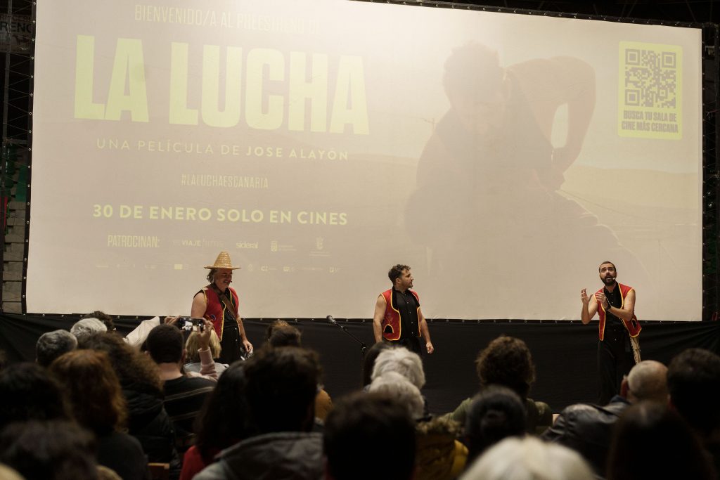 “¡Viva la cultura canaria!” El grito lo plantó Abubukaka en la arena del Terrero Insular Mencey Tegueste, con un ánimo que arrancó ecos de respuesta del público que asistió entusiasmado este martes, 27 de enero, a un acto inédito: la transformación de un terrero de lucha en un cine, para la presentación de la película La Lucha, de Jose Alayón.