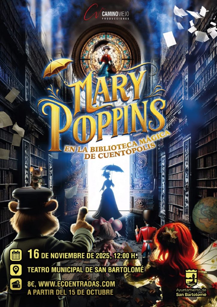 El Ayuntamiento de San Bartolomé, a través de la Concejalía de Cultura, conmemorará el Día Internacional de la Infancia, que se celebra cada 20 de noviembre, con una jornada especial dedicada a la infancia del municipio. La actividad tendrá lugar el domingo 16 de noviembre, a partir de las 12:00 horas, en el Teatro Municipal, con la representación de la obra familiar ‘Mary Poppins en la Biblioteca Mágica de Cuentópolis’.