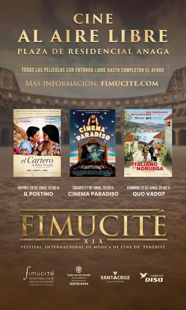 Santa Cruz de Tenerife se prepara para una de las citas más tradicionales de estas fechas: el ciclo de Cine de Verano de Fimucité. De la mano del Distrito Centro-Ifara, la decimonovena edición del Festival Internacional de Música de Cine de Tenerife y la Fundación DISA, la plaza de Residencial Anaga acoge tres sesiones de proyecciones gratuitas que se desarrollarán las noches del 20, 21 y 22 de junio.